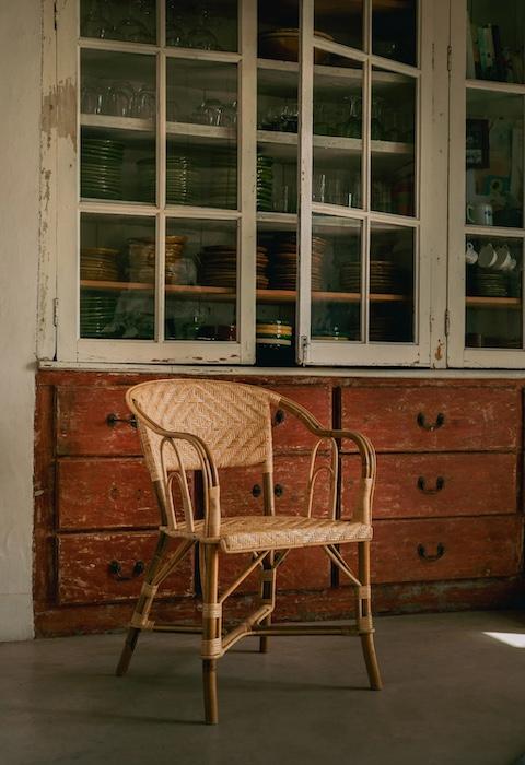 Asiento con bastidor de madera y tireta de junco de ratán trenzada a mano.