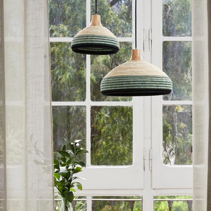 Lámparas Grass con pantalla hecha a mano de rafia y Abacá (una fibra vegetal que se obtiene de la parte interior del árbol de Abacá y que es conocida por su resistencia). La